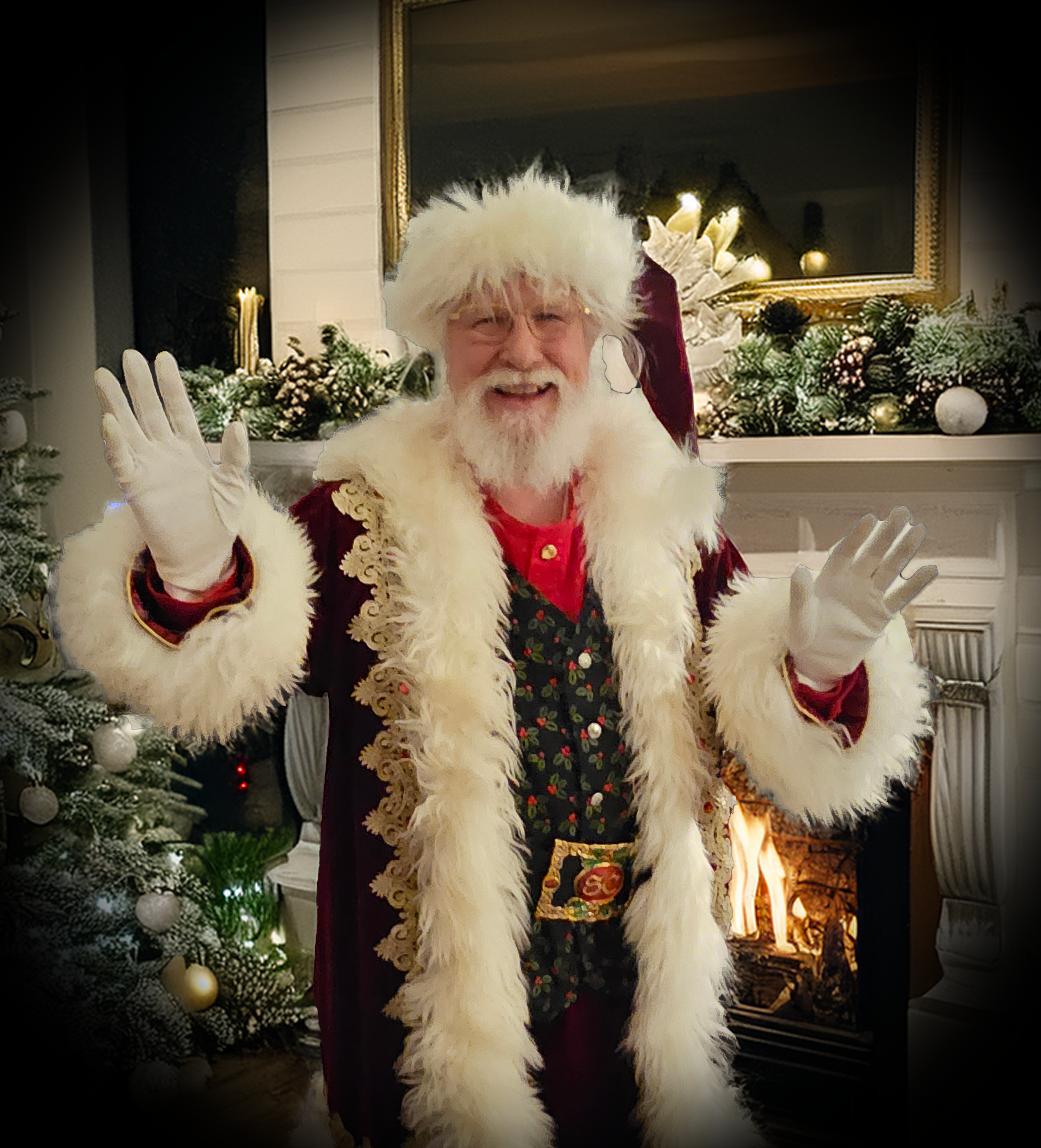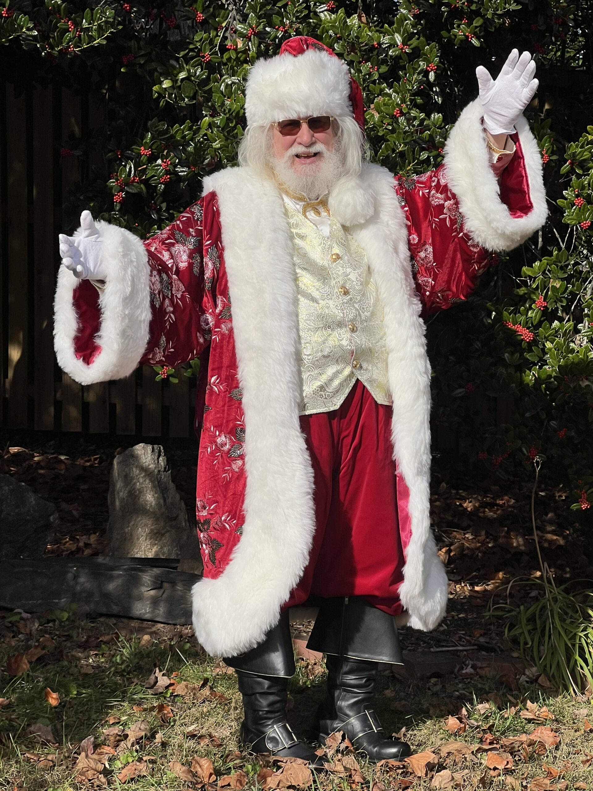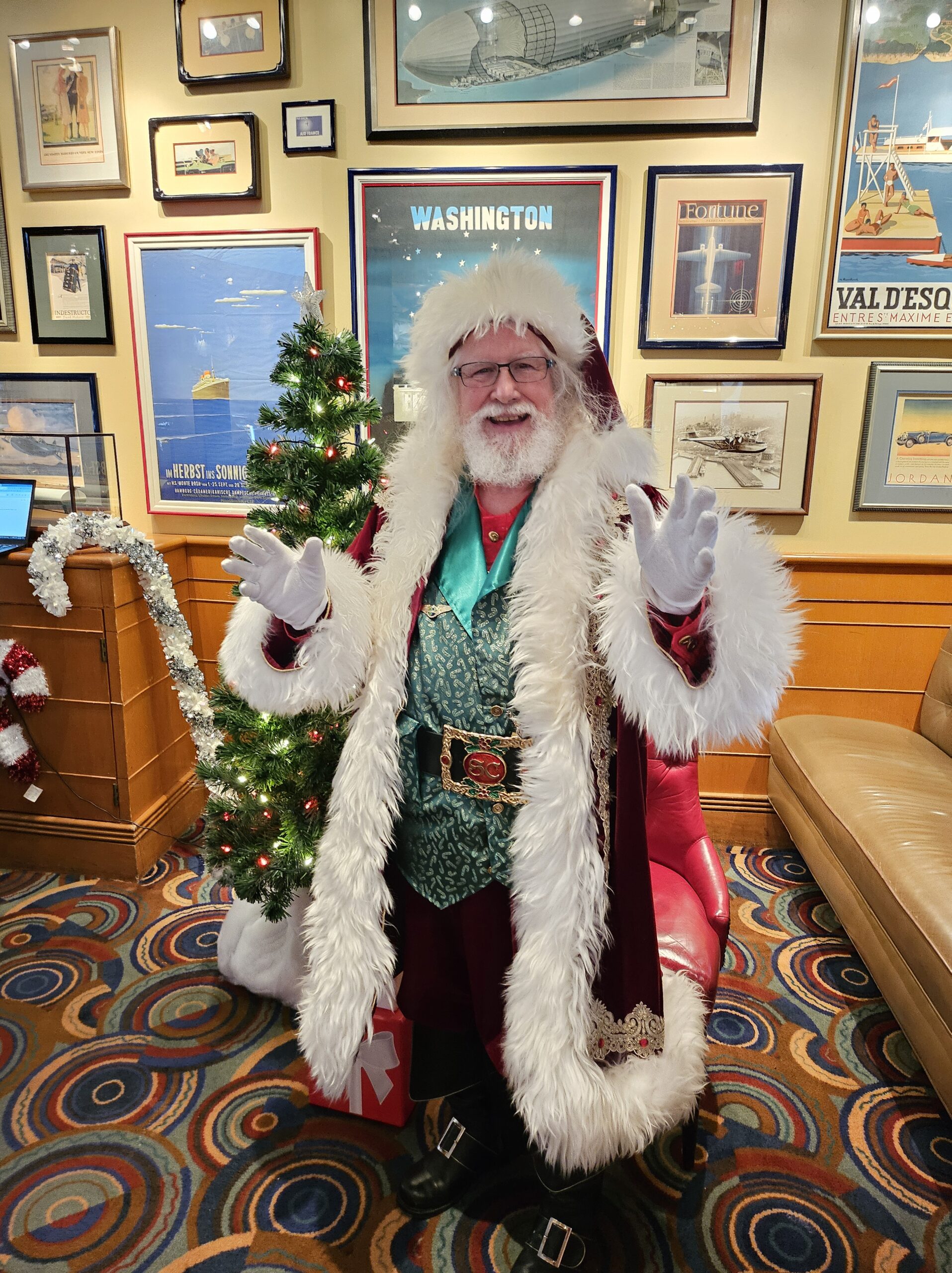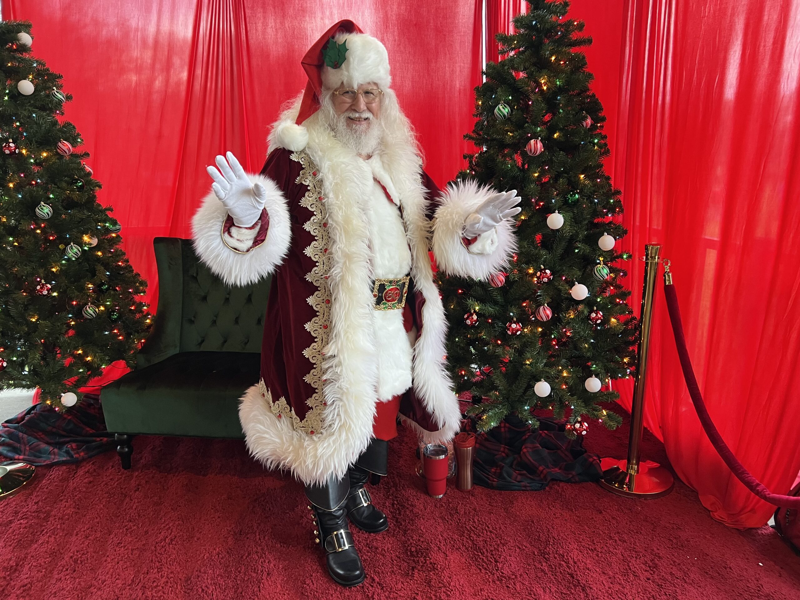 His custom-made attire includes knee-high black leather boots with a golden “S” for Santa Claus, a deep red suit with fur trim and matching hat, a 4-inch Holly motif black belt, and crisp white gloves, ensuring the authentic Santa experience for all. He even has a North Pole Driver’s license and a North Pole International Passport. He prefers being addressed as “Santa