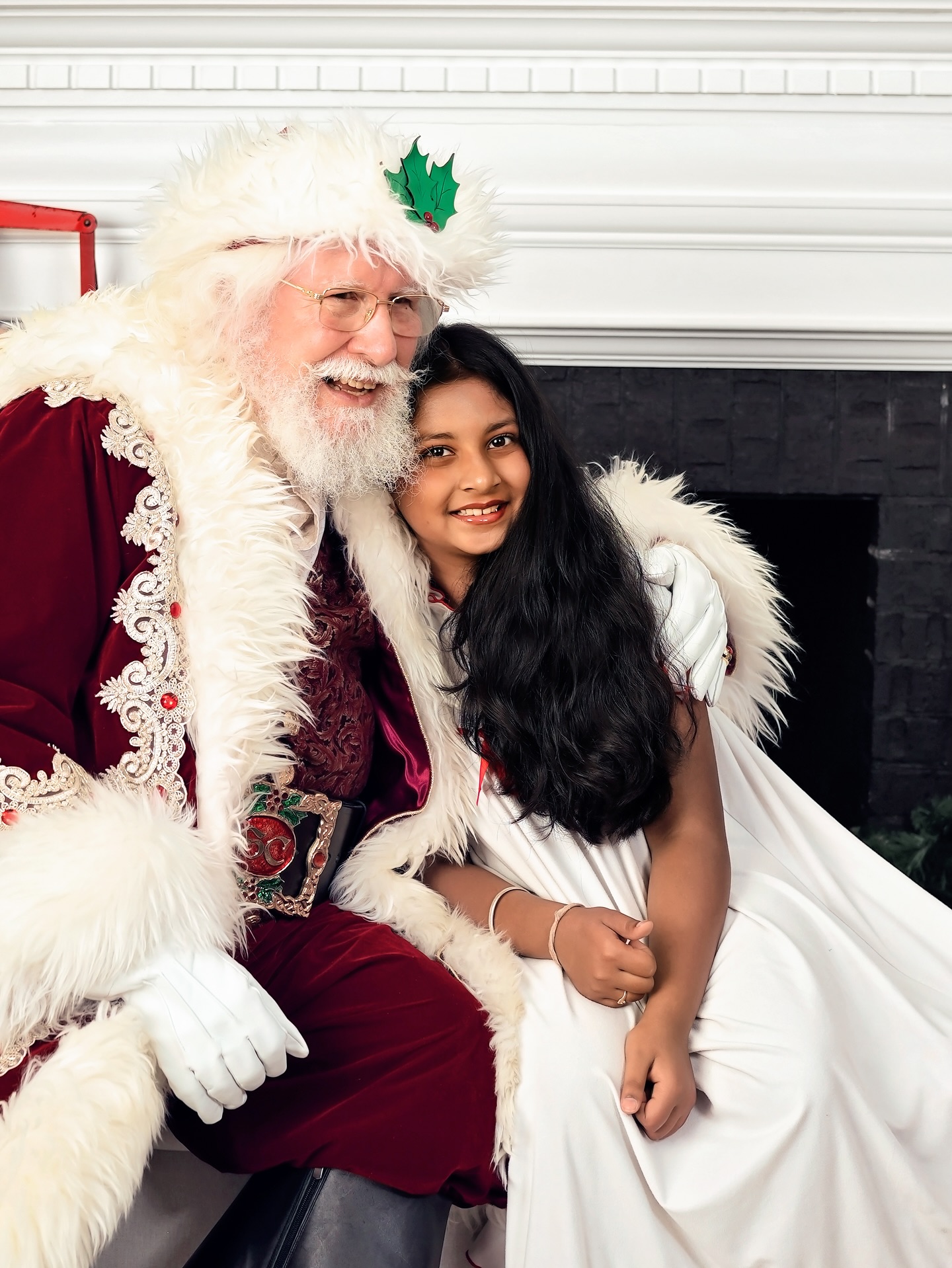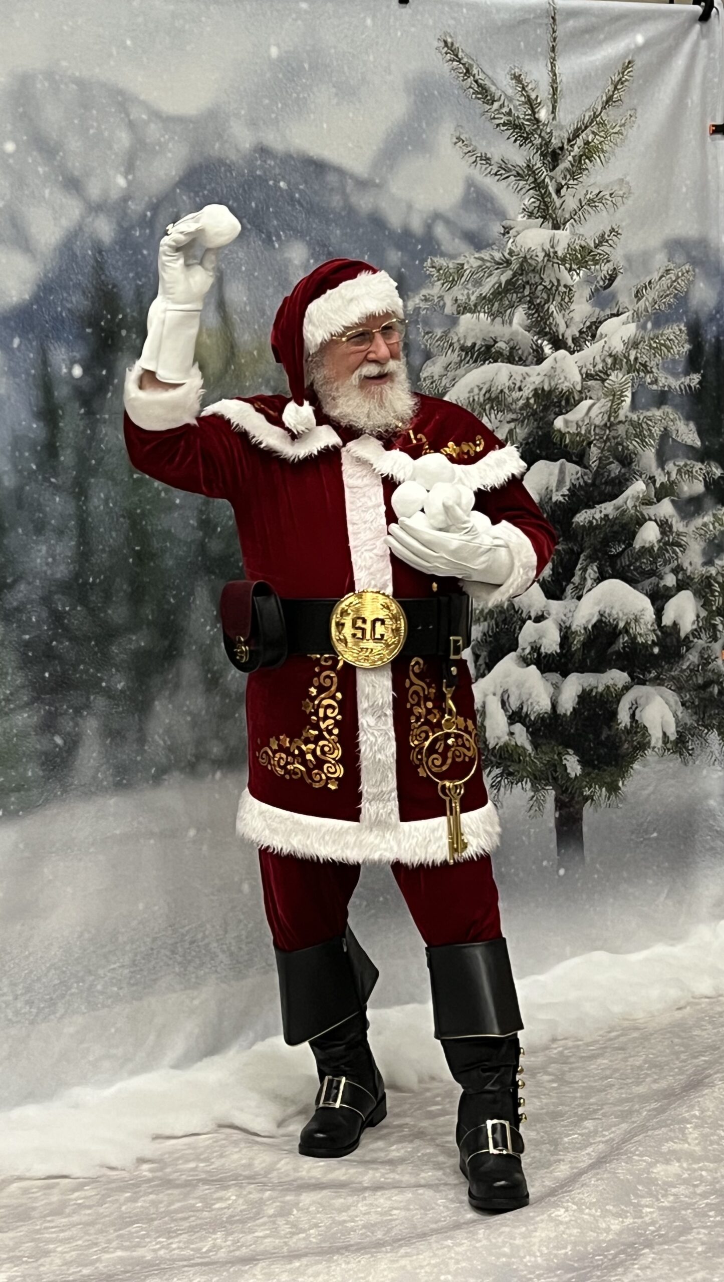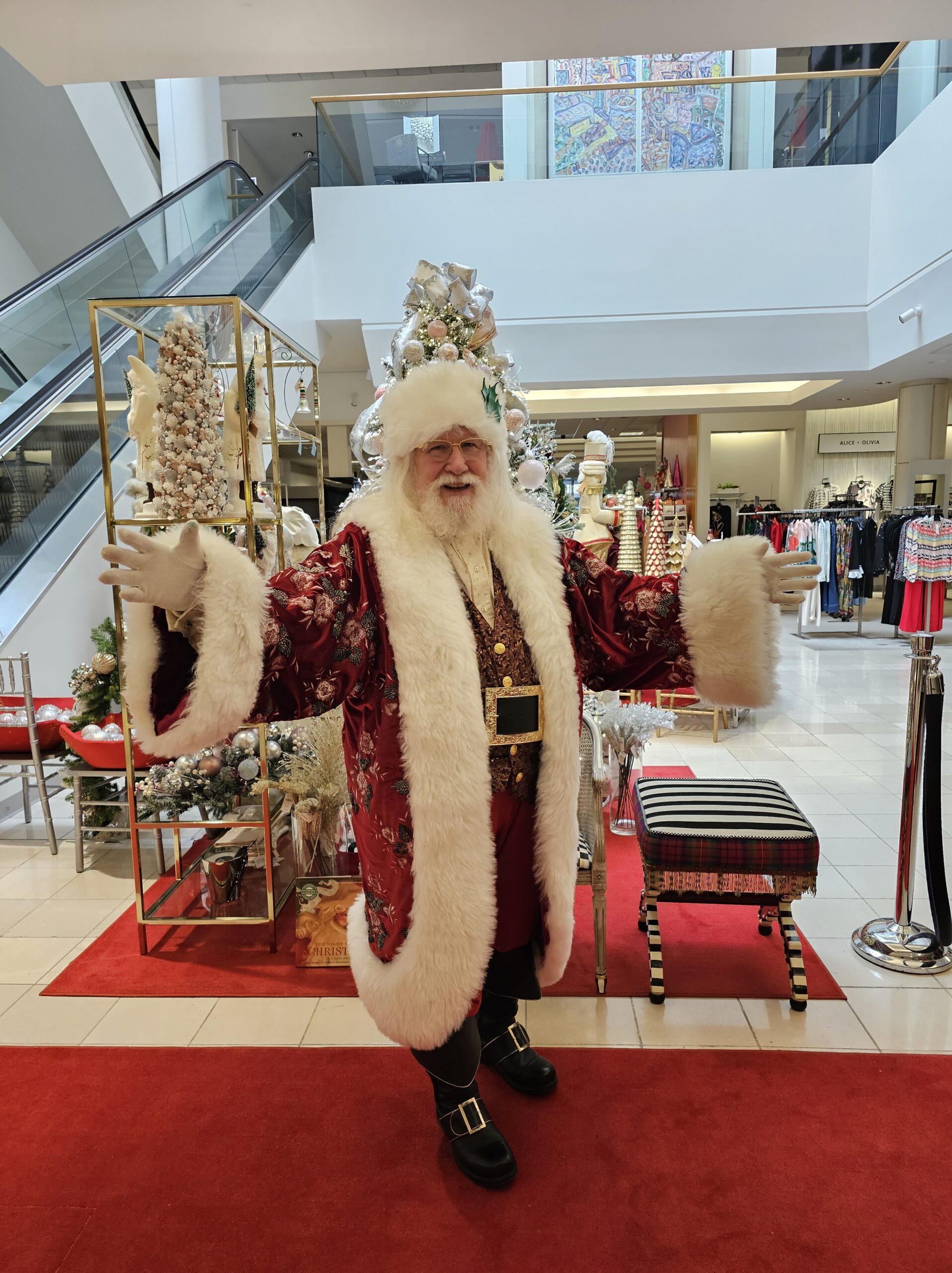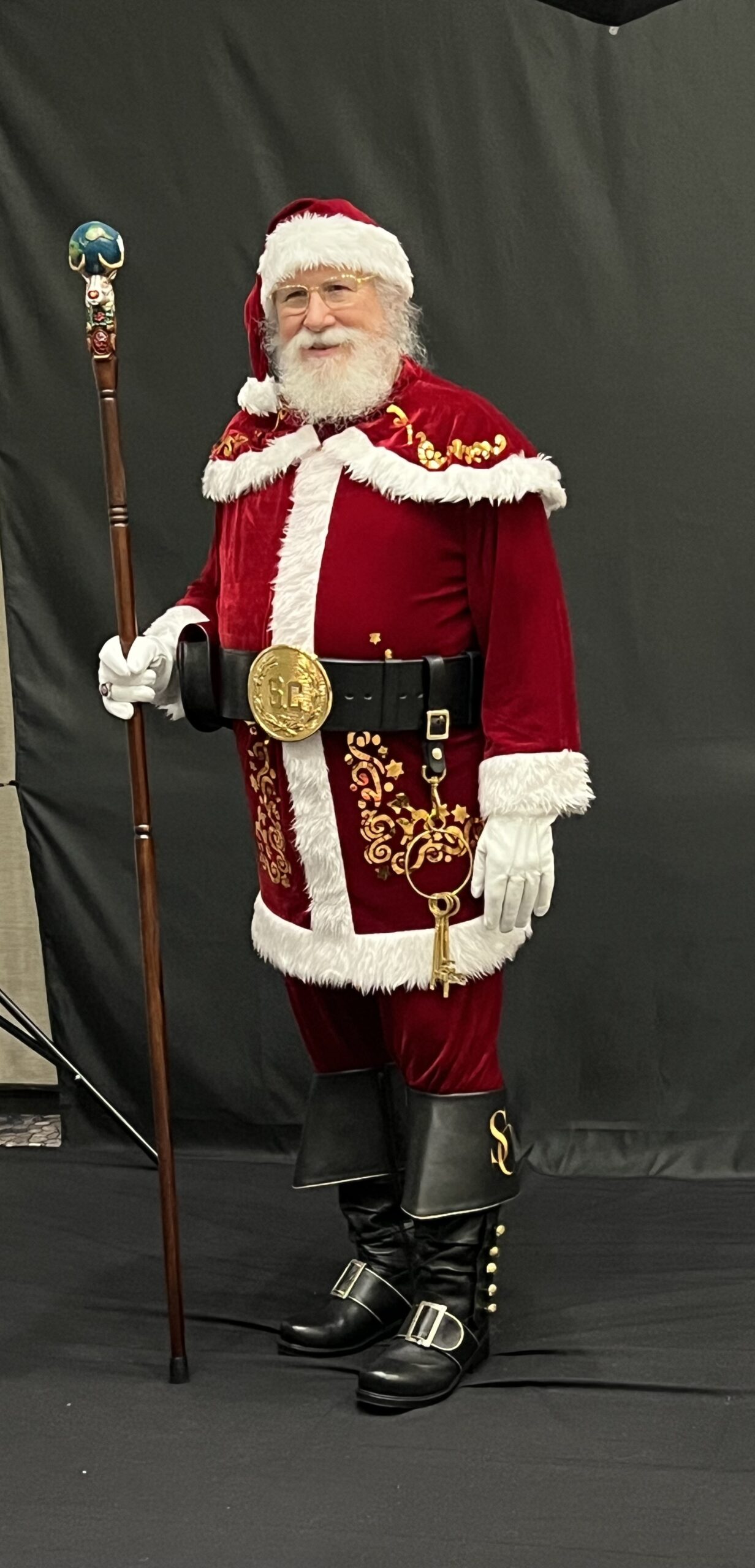 His custom-made attire includes knee-high black leather boots with a golden “S” for Santa Claus, a deep red suit with fur trim and matching hat, a 4-inch Holly motif black belt, and crisp white gloves, ensuring the authentic Santa experience for all. He even has a North Pole Driver’s license and a North Pole International Passport. He prefers being addressed as “Santa